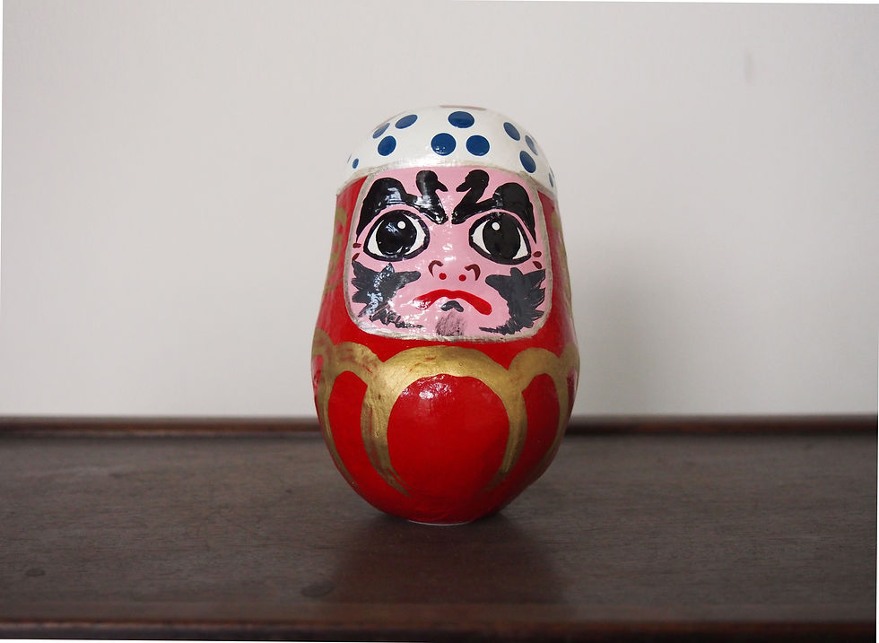 独特の細長い形に、「願いが成るように」と鳴り物の鈴や小石をいれ、先を見通せるよう両目が書き入れられ、倒れても起き上がる“起き上がりだるま”の形は「七転八起」を象徴しており、一つひとつ手作業で大切に作られています。